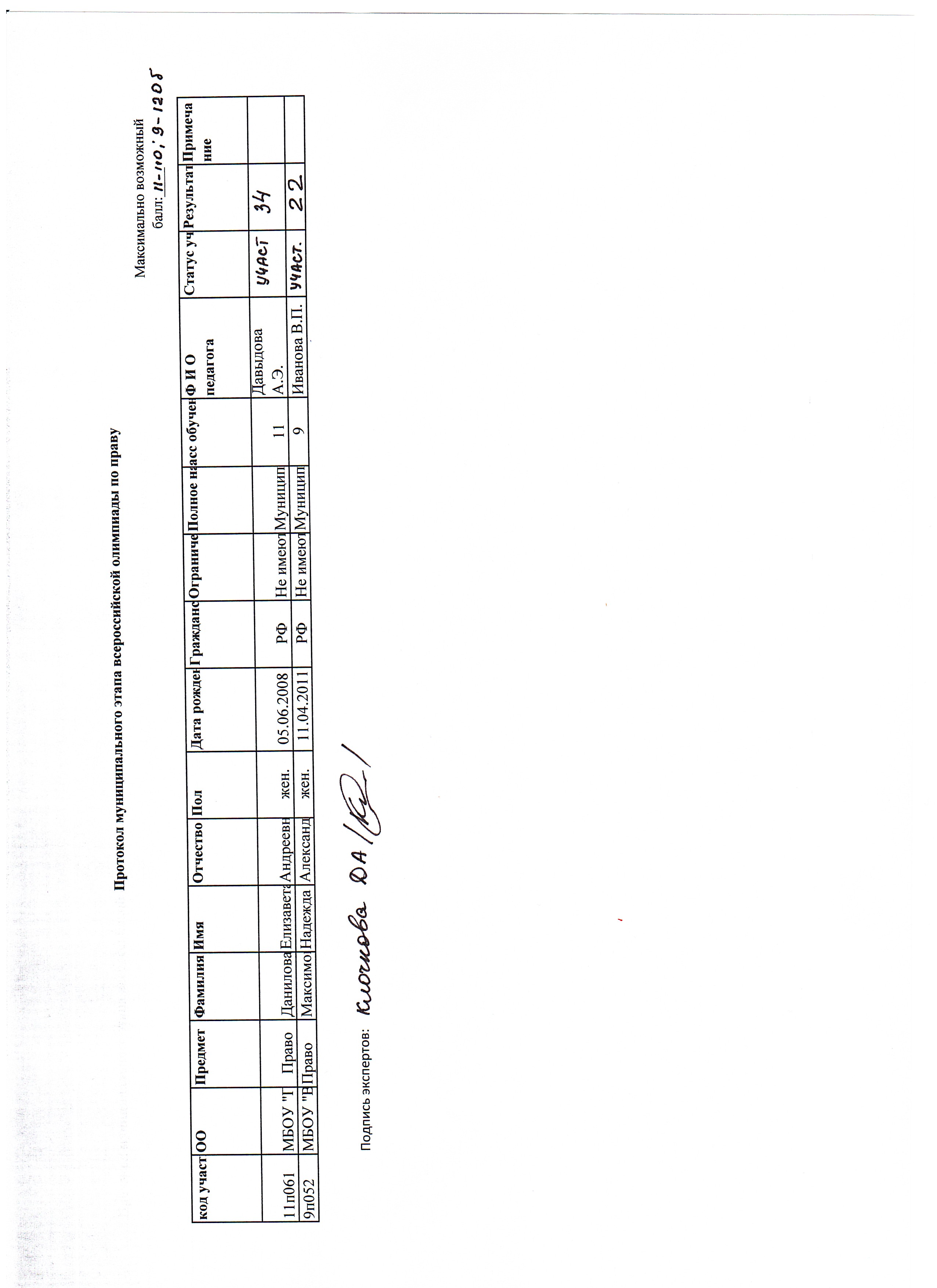 Протокол муниципального этапа всероссийской олимпиады школьников по праву 9-11 класс