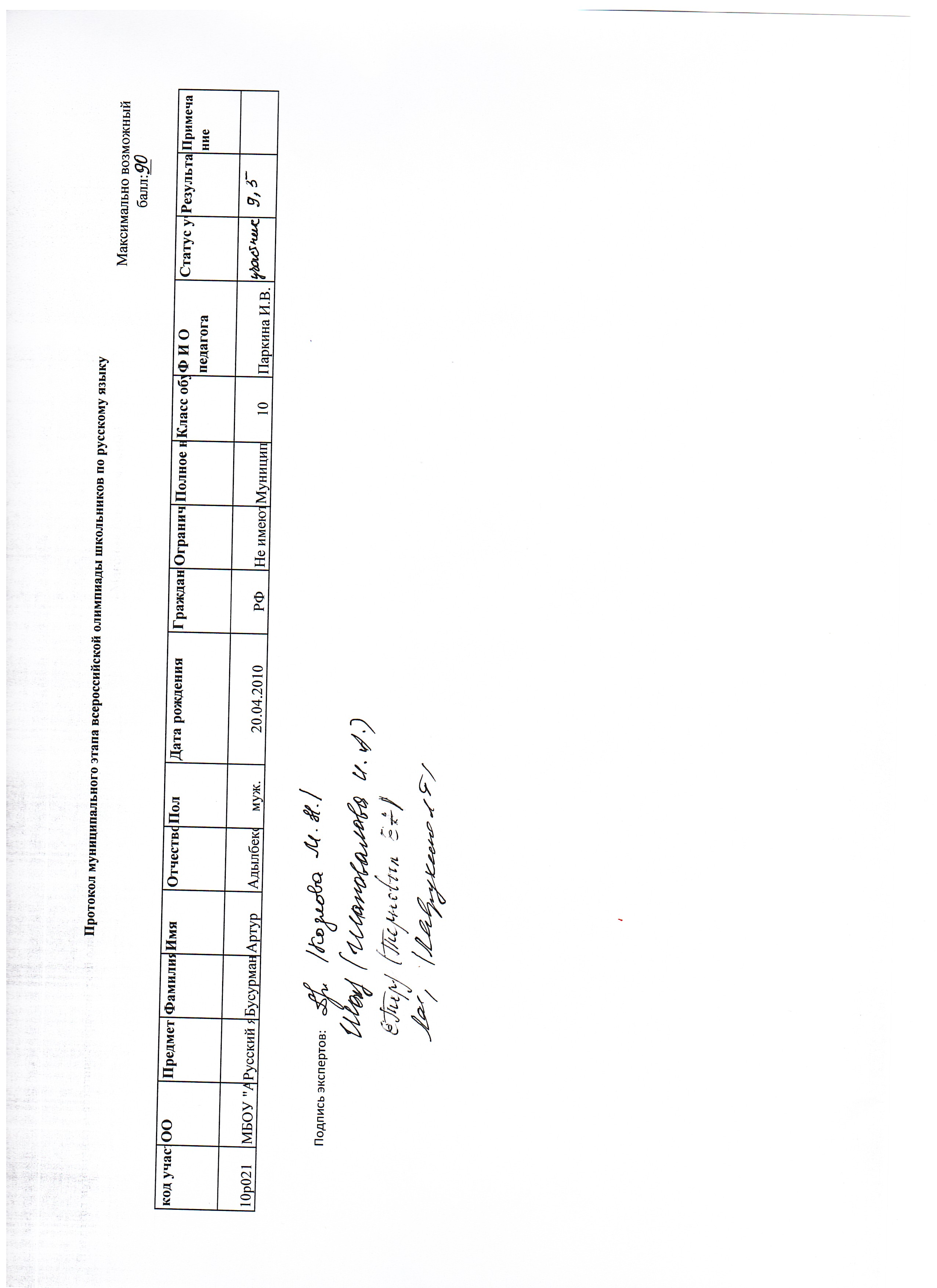 Протокол муниципального этапа всероссийской олимпиады школьников по русскому языку 10 класс