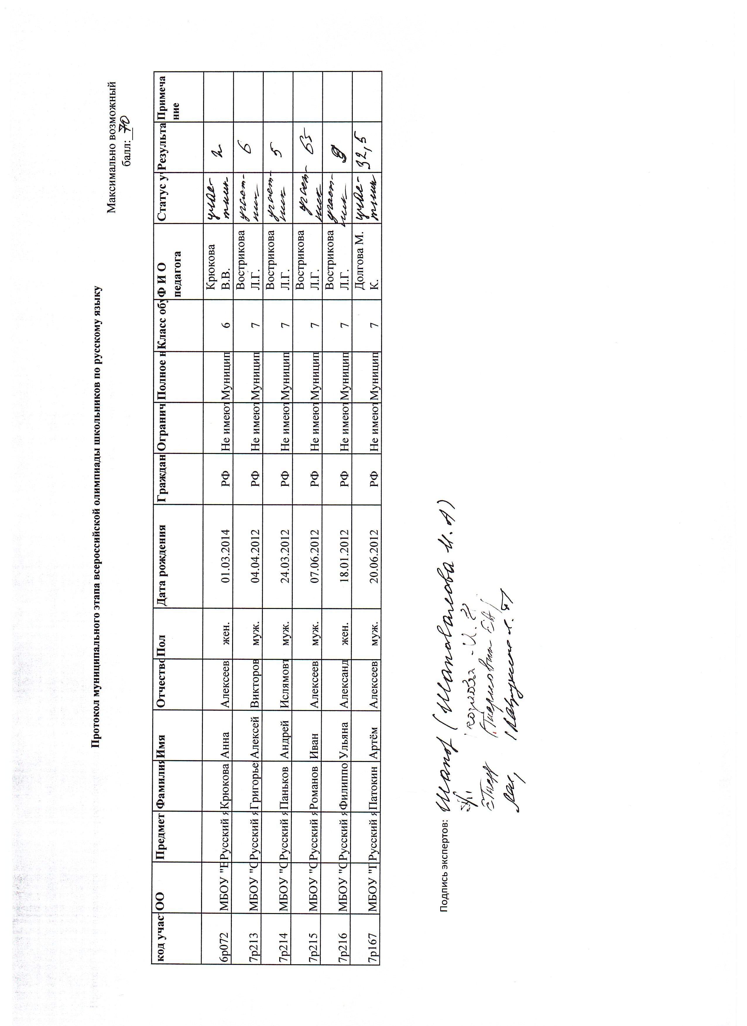 Протокол муниципального этапа всероссийской олимпиады школьников по русскому языку 7 класс