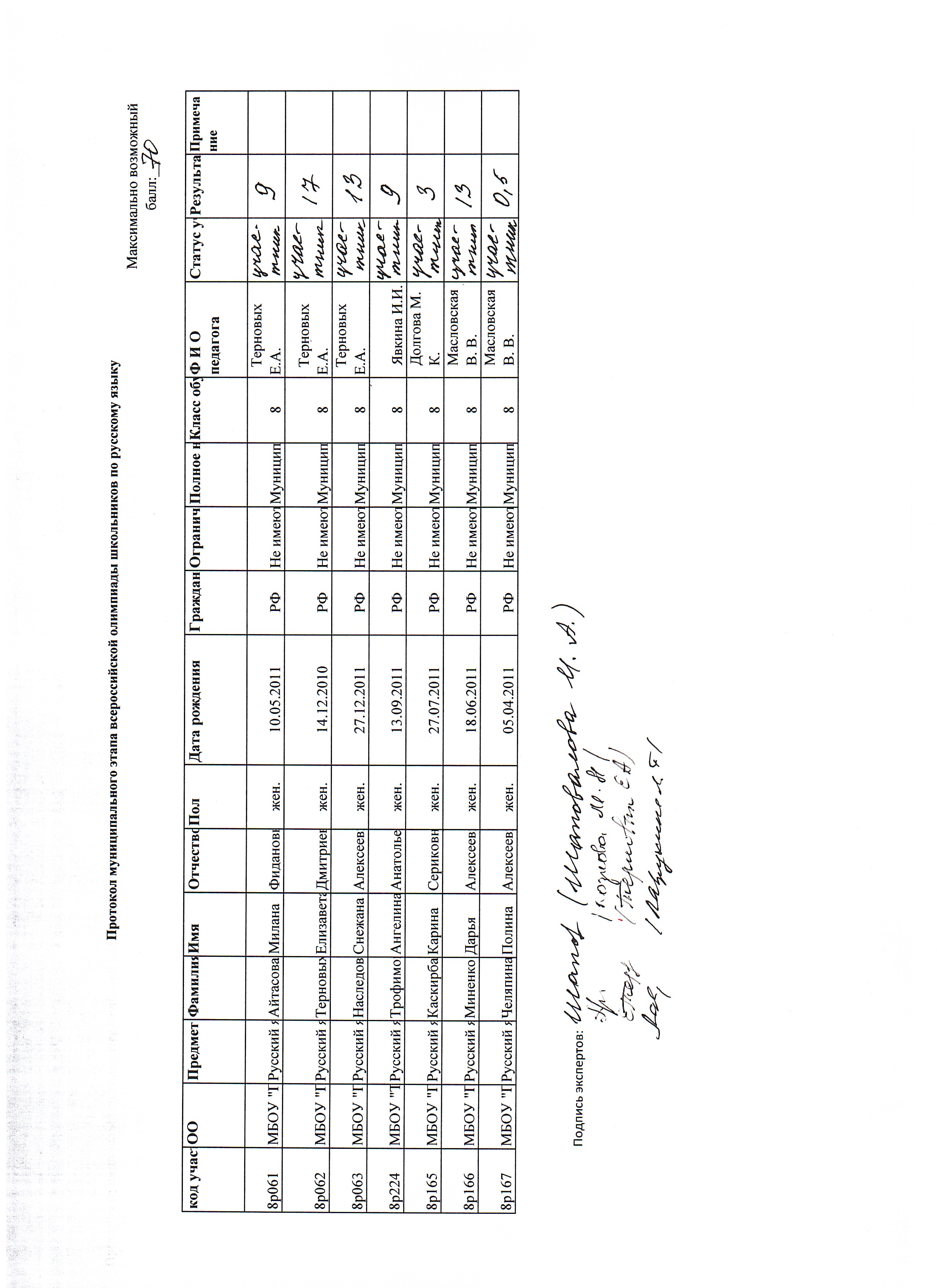 Протокол муниципального этапа всероссийской олимпиады школьников по русскому языку 8 класс