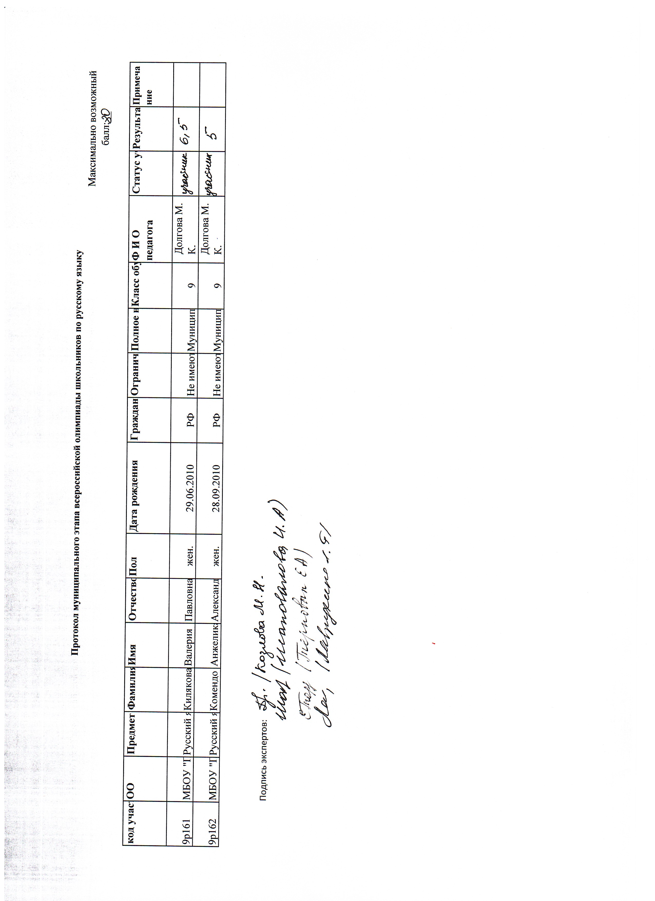Протокол муниципального этапа всероссийской олимпиады школьников по русскому языку 9 класс